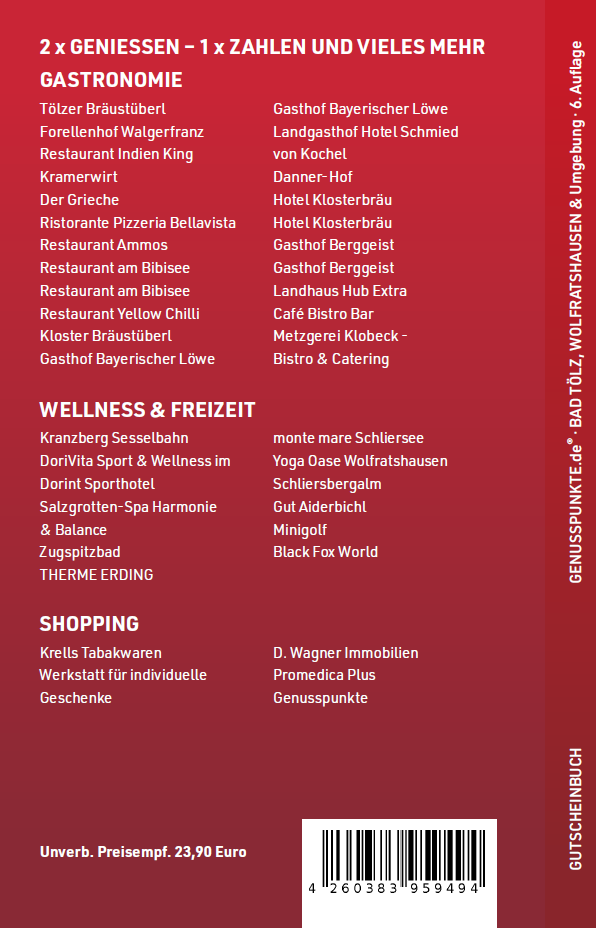 Für nur 23,90 € sind die „GenussPUNKTE classic Bad Tölz, Wolfratshausen + Umgebung“ nicht nur ein nützlicher persönlicher Ratgeber für Genießer, sondern auch ein attraktives und wertvolles Geschenk für jede Gelegenheit.
