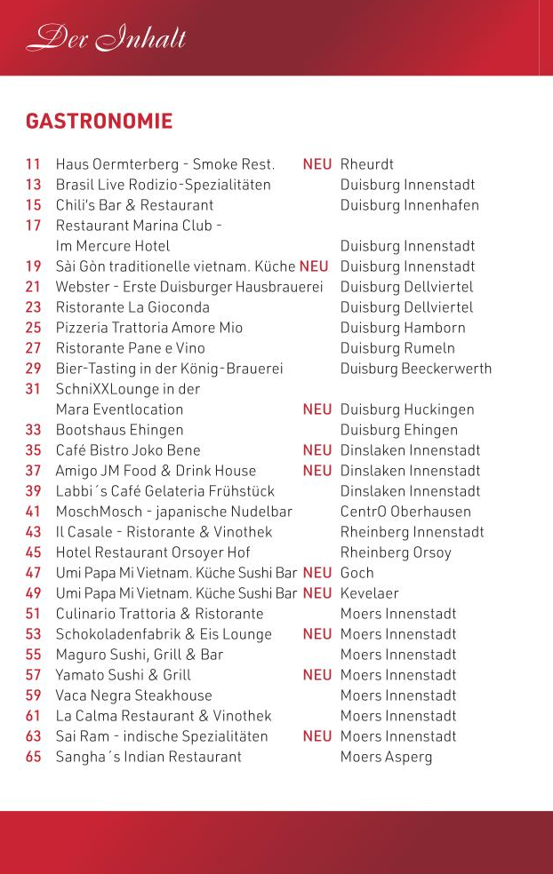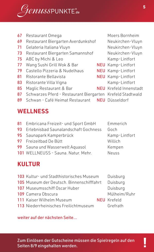 76 Anbieter aus Duisburg und Moers und der Region stellen mit Texten und Bildern ihre reichhaltigen Angebote in den GenussPUNKTEN vor, stets verbunden mit einem oder mehreren Gutscheinen, die lukrative Genussvorteile für Gäste und Besucher bringen.