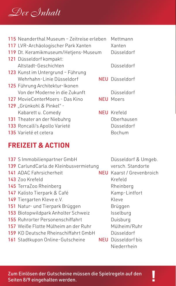 172 Seiten umfasst das kompakte „Alles-drin-Buch“, darunter 60 Restaurants und Cafés sowie 43 Freizeit, Wellness, Kunst + Kultur-Ideen mit Gutscheinen für die ganze Familie.