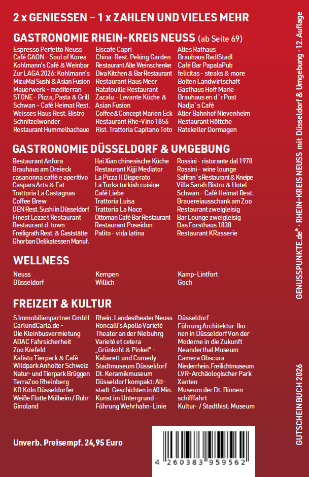 Die schönen Momente des Lebens genießen: zu zweit oder gemeinsam mit der Familie und Freunden.Genau dafür bietet diese Auflage des etwas anderen Gutscheinbuches GenussPUNKTE zahlreiche Tipps und Angebote rund um Gastronomie, Freizeit, Kultur und Wellness.96 Anbieter aus Düsseldorf mit Rhein-Kreis Neuss und der Region stellen mit Texten und Bildern ihre reichhaltigen Angebote in den GenussPUNKTEN vor, stets verbunden mit einem oder mehreren Gutscheinen, die lukrative Genussvorteile für Gäste und Besucher bringen.Mit seiner hochwertigen, sehr ansprechenden Aufmachung passt das praktische Taschenbuch in jede Handtasche und ist ein idealer Begleiter für unterhaltsame und lukullische Entdeckungsreisen.212 Seiten umfasst das kompakte „Alles-drin-Buch“, darunter 88 Gastronomie-Gutscheine sowie 41 herrliche Freizeit-, Kunst-, Kultur- und Wellness-Ideen für Düsseldorf mit Rhein-Kreis Neuss und Umgebung mit Gutscheinen für die ganze Familie.Die im Buch enthaltenen 2für1-, Wert- und Rabatt-Gutscheine können ab sofort eingelöst werden und gelten bis zum 28.02.2027.Für nur 24,95 € sind die „GenussPUNKTE classic Düsseldorf mit Rhein-Kreis Neuss & Umgebung“ nicht nur ein nützlicher persönlicher Ratgeber für Genießer, sondern auch ein attraktives und wertvolles Geschenk für jede Gelegenheit.Mit freundlichen GrüßenIhrGutscheinbuchShop-Team Hersteller: Agentur Coupon Concept Matthias Tänzler Plankerdyk 57 47839 Krefeld E-Mail: info@genusspunkte.de