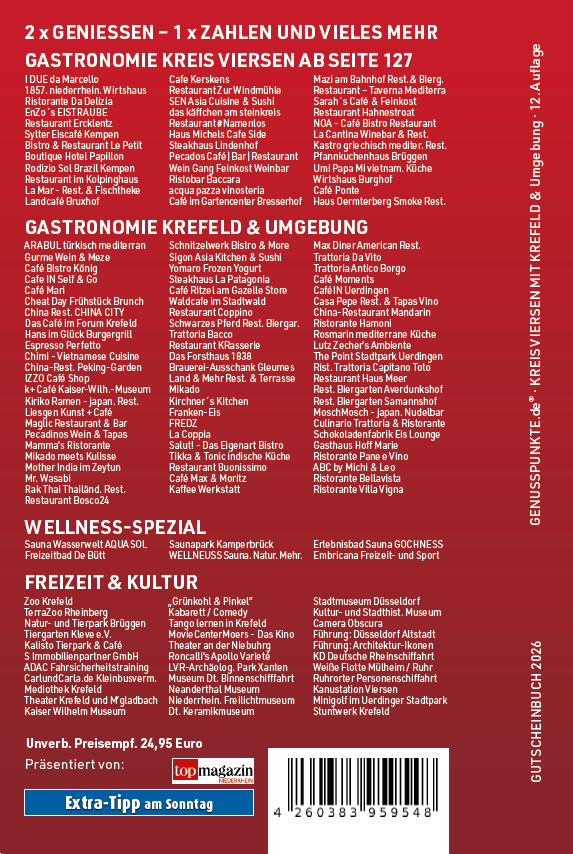 Die schönen Momente des Lebens genießen: zu zweit oder gemeinsam mit der Familie und Freunden. Genau dafür bietet die Auflage des etwas anderen Gutscheinbuches GenussPUNKTE zahlreiche Tipps und Angebote rund um Gastronomie, Freizeit, Kultur und Wellness. Ganze 144 Anbieter aus Krefeld mit Kreis Viersen und der Region stellen mit Texten und Bildern ihre reichhaltigen Angebote in den GenussPUNKTEN vor, stets verbunden mit einem oder mehreren Gutscheinen, die lukrative Genussvorteile für Gäste und Besucher bringen. Mit seiner hochwertigen, sehr ansprechenden Aufmachung passt das praktische Taschenbuch in jede Handtasche und ist ein idealer Begleiter für unterhaltsame und lukullische Entdeckungsreisen. 308 Seiten umfasst das kompakte „Alles-drin-Buch“, darunter 150 Restaurants und Cafés sowie 46 Freizeit, Wellness, Kunst + Kultur-Ideen mit Gutscheinen für die ganze Familie. Die im Buch enthaltenen 2für1-, Wert- und Rabatt-Gutscheine können ab sofort eingelöst werden und gelten bis zum 28.02.2027. Für nur 39,90 € sind die „GenussPUNKTE classic Krefeld mit Kreis Viersen + Umgebung“ nicht nur ein nützlicher persönlicher Ratgeber für Genießer, sondern auch ein attraktives und wertvolles Geschenk für jede Gelegenheit. Mit freundlichen GrüßenIhrGutscheinbuchShop-Team Hersteller:Agentur Coupon Concept Matthias Tänzler Plankerdyk 57 47839 KrefeldE-Mail: info@genusspunkte.de